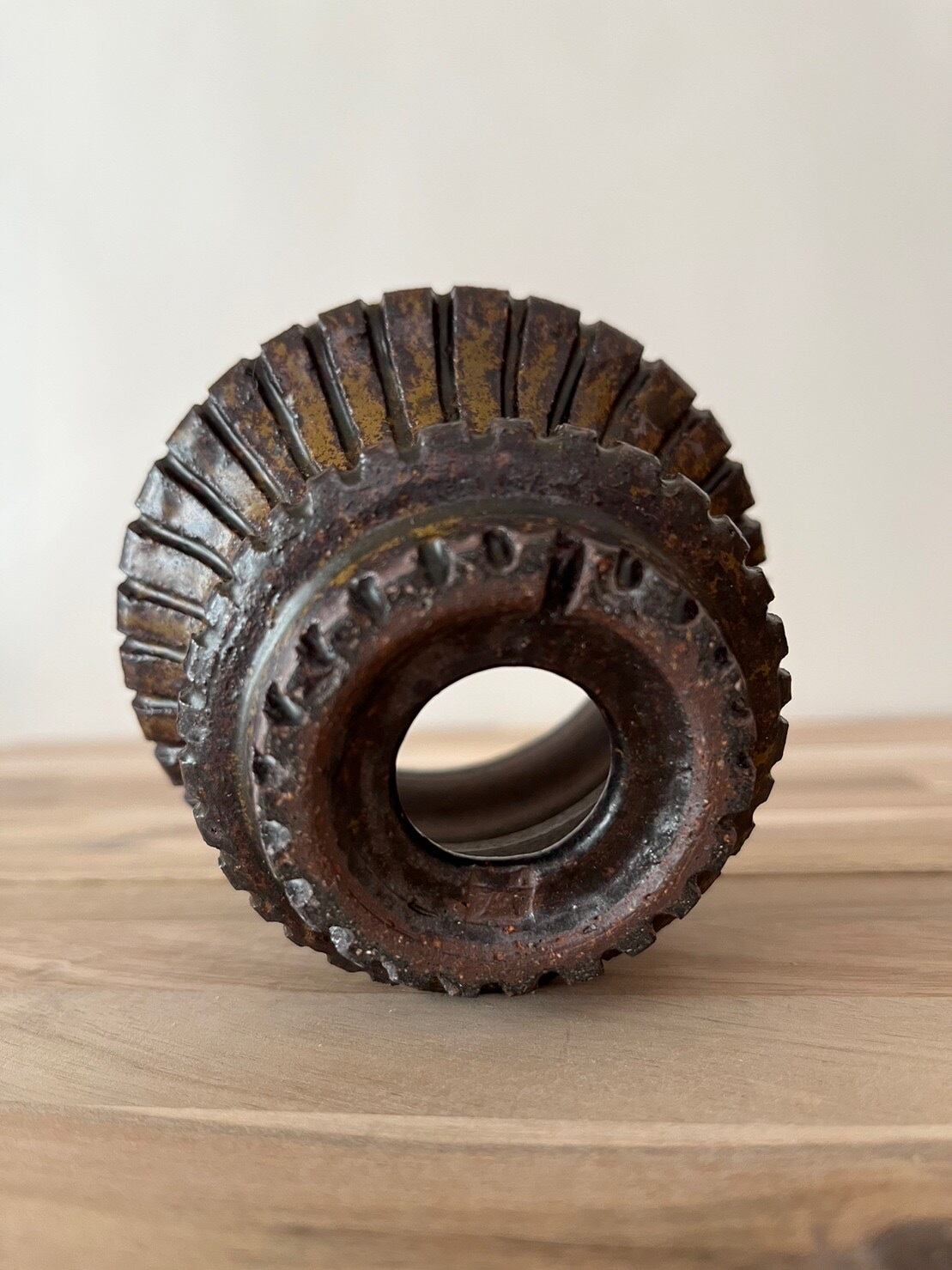 裏を覗くと足の部分を歯車型に彫り込んだ遊びがあります。