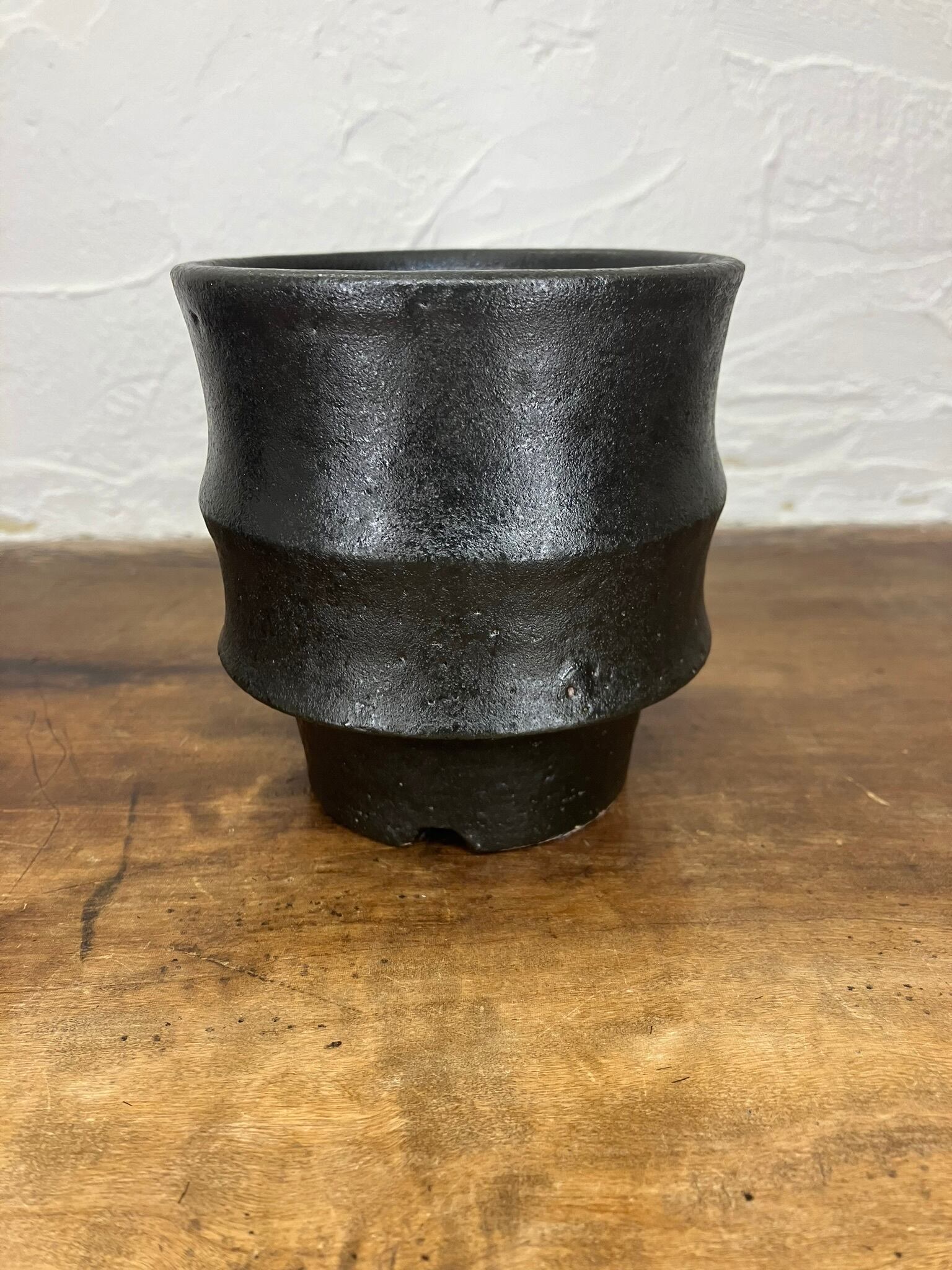 遺跡・廃墟をイメージした作品。黒マットに染み込んだ光彩釉が光の角度によって輝きを変化させる。