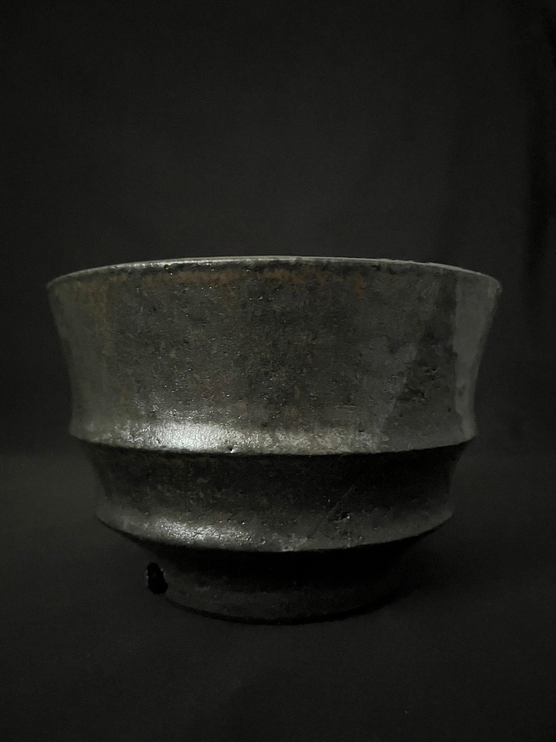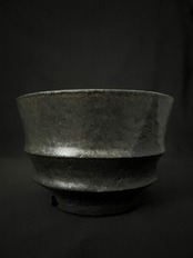 遺跡・廃墟をイメージした作品。黒マットに染み込んだ光彩釉が光の角度によって輝きを変化させる。