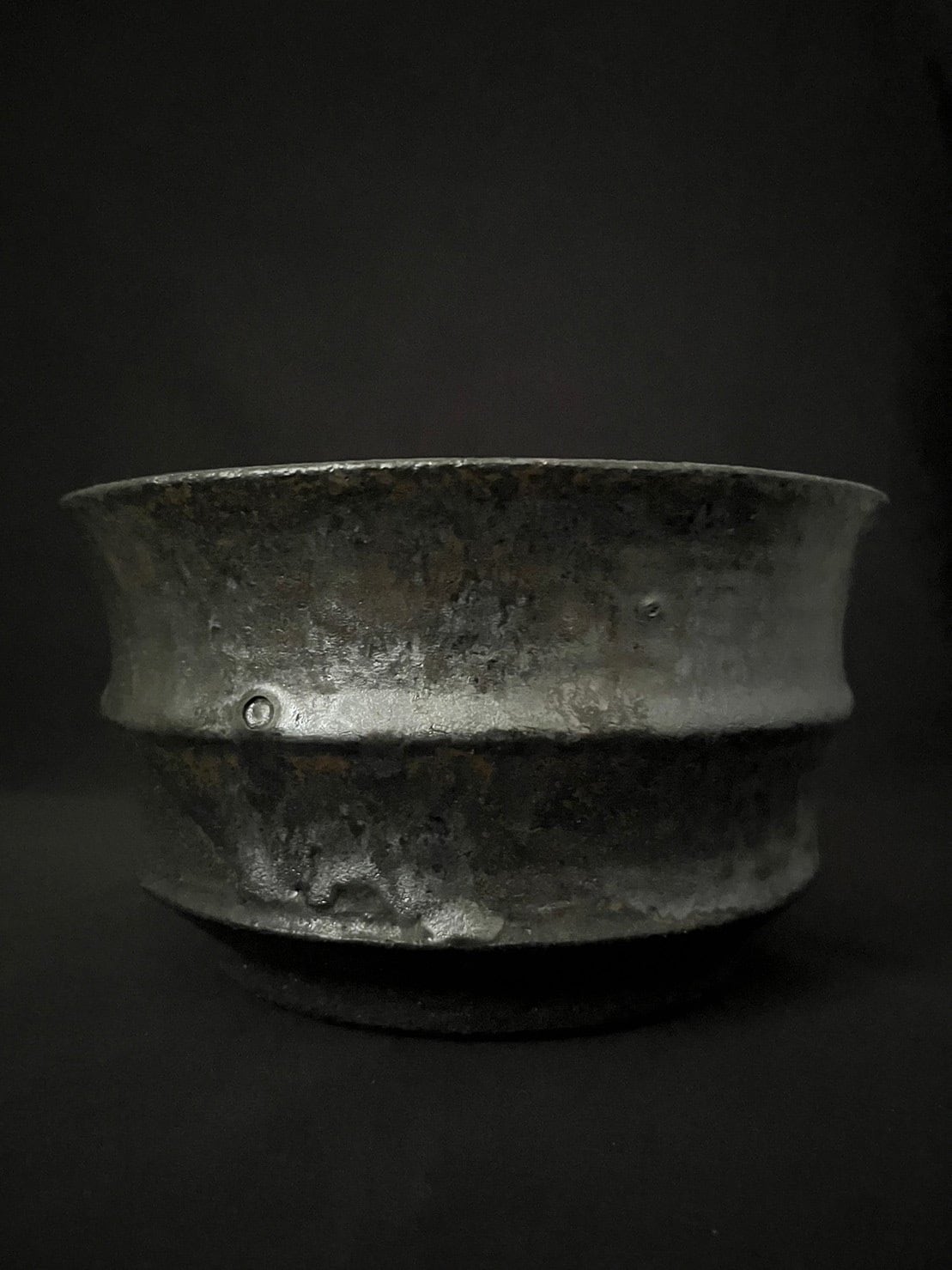 遺跡・廃墟をイメージした作品。黒マットに染み込んだ光彩釉が光の角度によって輝きを変化させる。